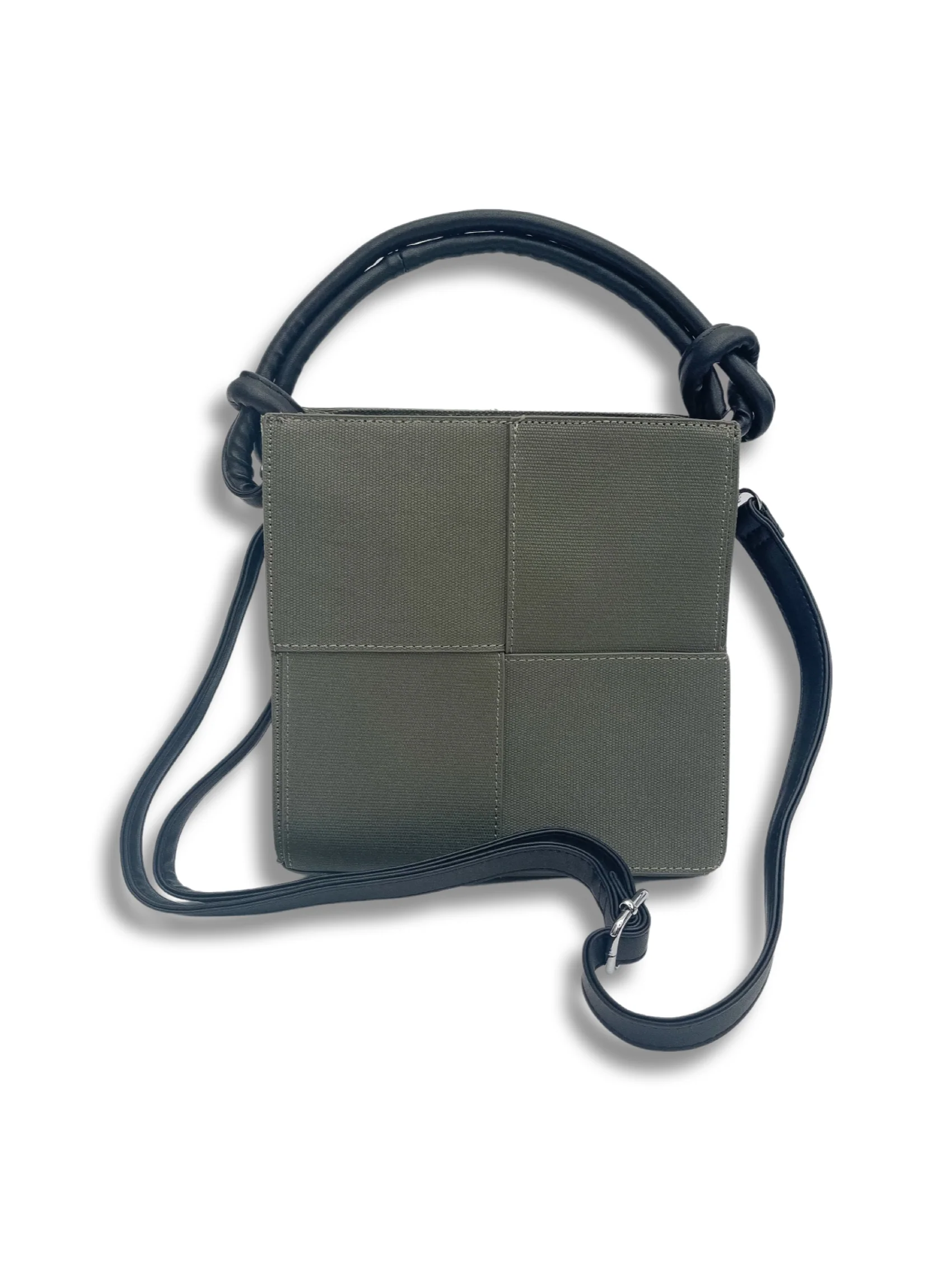 4 interlocking canvas panels with zip internal storage and shoulder strap.