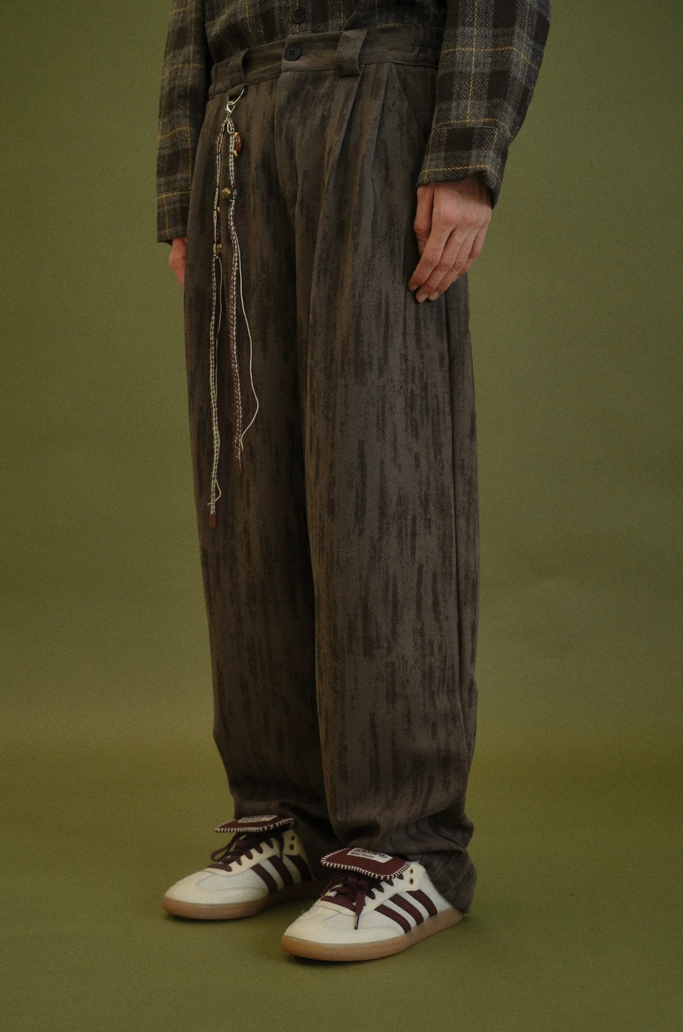 Lightweight wool blend spring trouser in mottled shades of Nilo-Saharan earth. Detachable lace charm key chain.