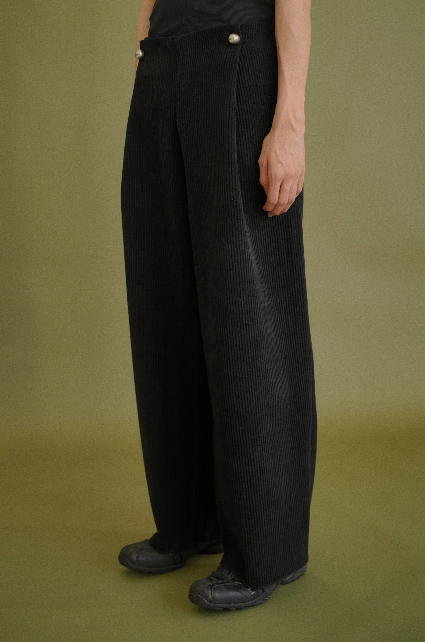 Wide-leg pleated pant featuring point button fastening.