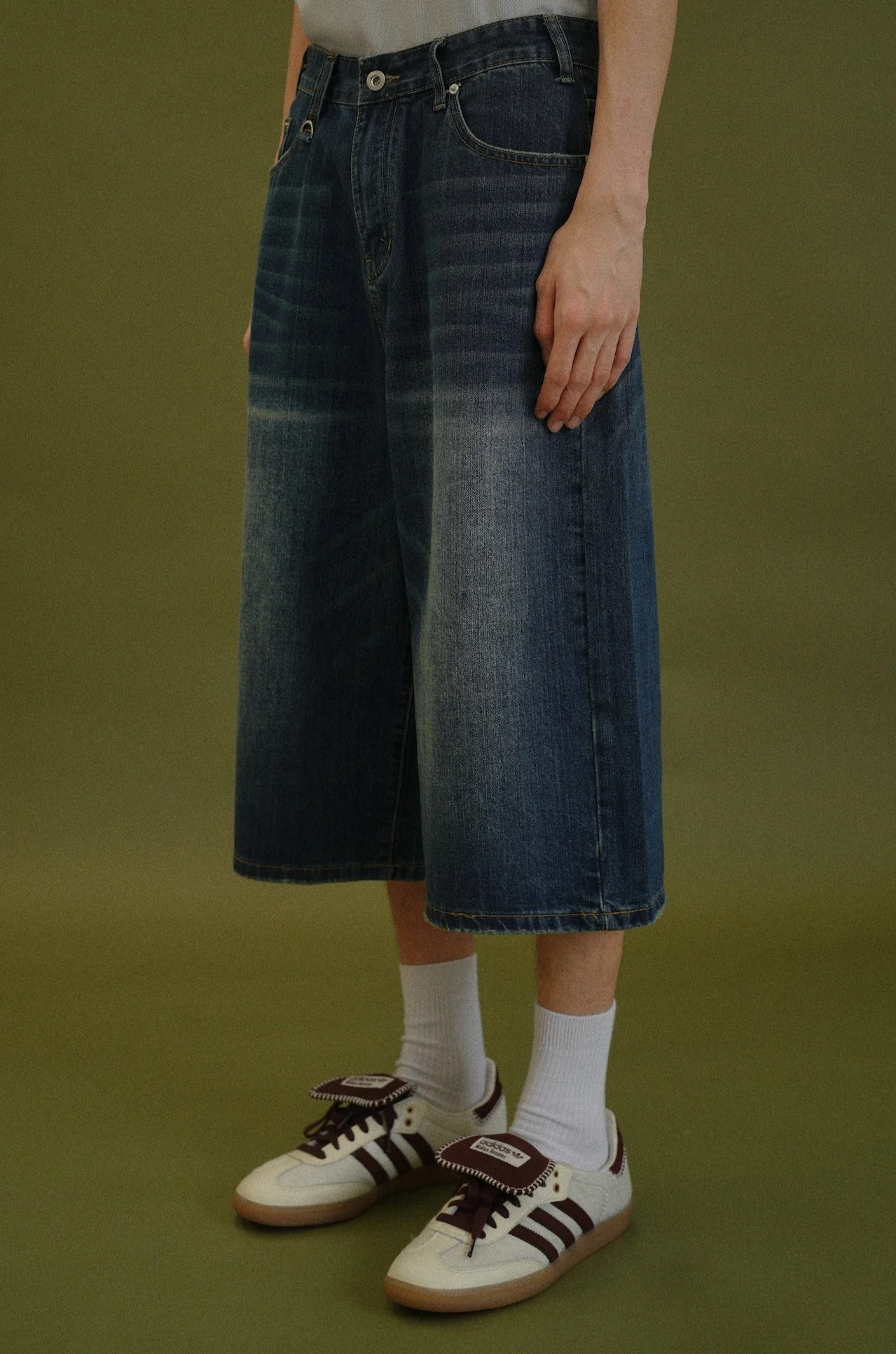 Wide-leg 3/4 length jean shorts with keychain loop in washed denim.