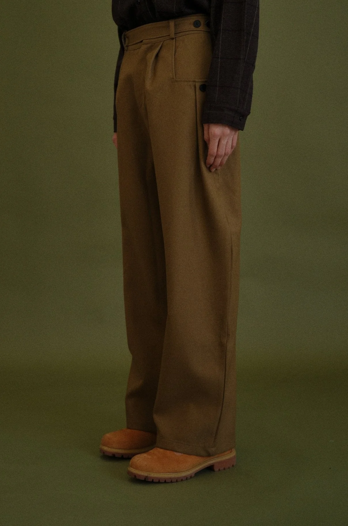 Mid-weight cargo trousers with waistband belt fastening and side widen buttons.